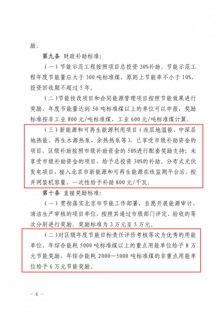 通知明確:新能源和可再生能源利用項(xiàng)目已享受市級(jí)補(bǔ)助資金的項(xiàng)目,區(qū)級(jí)補(bǔ)助按照市級(jí)補(bǔ)助資金的50%進(jìn)行配套獎(jiǎng)勵(lì)支持;未享受市級(jí)補(bǔ)助資金的項(xiàng)目,給予總投資30%的補(bǔ)助。分布式光伏發(fā)電項(xiàng)目,接入北京市新能源和可再生能源在線監(jiān)測(cè)平臺(tái)后,接并網(wǎng)裝機(jī)容量,一次性給予補(bǔ)助800元/千瓦。