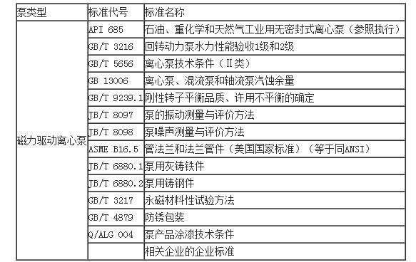 六、泵的設(shè)計(jì)、制造、檢驗(yàn)應(yīng)符合有關(guān)標(biāo)準(zhǔn)、規(guī)范的規(guī)定,常用磁力驅(qū)動(dòng)離心泵的類型、標(biāo)準(zhǔn)代號(hào)及標(biāo)準(zhǔn)名稱見表1。