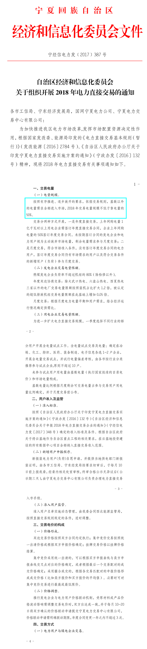 近日,寧夏經信委發(fā)布《關于組織開展2018年電力直接交易的通知》(以下簡稱“通知”),通知中稱,基數意外的電量需求全部進入市場,2018年交易電量不低于售電量的50%。