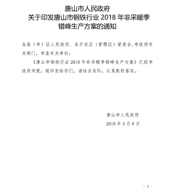 日前,《唐山市鋼鐵行業(yè)2018年非采暖季錯峰生產(chǎn)方案》經(jīng)市政府同意,已正式下發(fā)。方案中明確了錯峰生產(chǎn)依據(jù)和原則,綜合考慮唐山市環(huán)境空氣質(zhì)量現(xiàn)狀、鋼鐵企業(yè)所處區(qū)域和氣象條件,對全市鋼鐵企業(yè)實施非采暖季精準(zhǔn)化、差異化錯峰生產(chǎn)。全文如下: