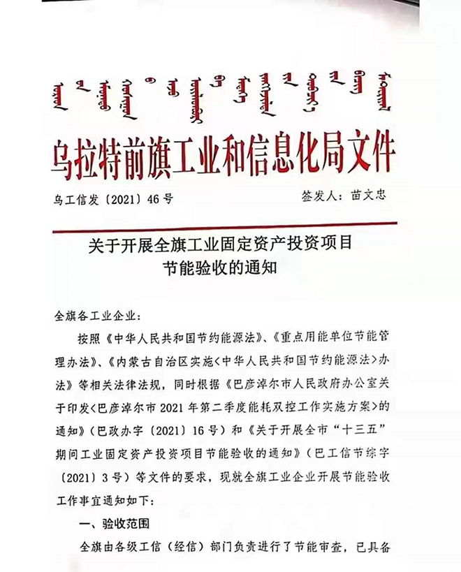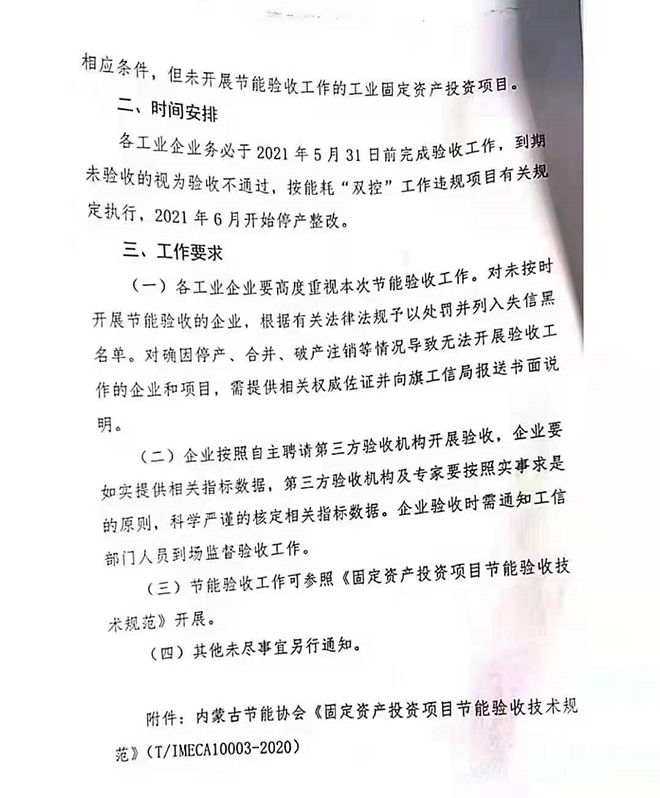 烏拉特前旗:對全旗工業(yè)企業(yè)開展節(jié)能審查驗收,對期限內(nèi)驗收不通過的企業(yè),按能耗“雙控”工作違規(guī)項目有關規(guī)定執(zhí)行停產(chǎn)整改。