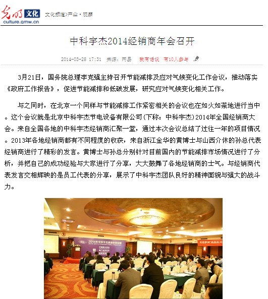 與之同時,在北京一個同樣與節(jié)能減排工作緊密相關(guān)的會議也在如火如荼地進行當中。這個會議就是北京中科宇杰節(jié)電設備有限公司(下稱:中科宇 杰)2014年全國經(jīng)銷商大會。來自全國各地的中科宇杰經(jīng)銷商匯聚一堂,通過本次會議總結(jié)了過往一年的項目情況。2013年各地經(jīng)銷商都有不同程度的收 獲,來自浙江金華的黃博士與山西介休的孫總代表經(jīng)銷商進行了精彩的發(fā)言。黃博士與孫總分別針對目前國內(nèi)的節(jié)能減排市場情況進行了分析,并把自己的成功經(jīng)驗 與大家進行了分享,大大鼓舞了各地經(jīng)銷商的士氣。與經(jīng)銷商代表發(fā)言交相輝映的是員工代表的分享,展示了中科宇杰團隊良好的精神面貌與強大的戰(zhàn)斗力。
