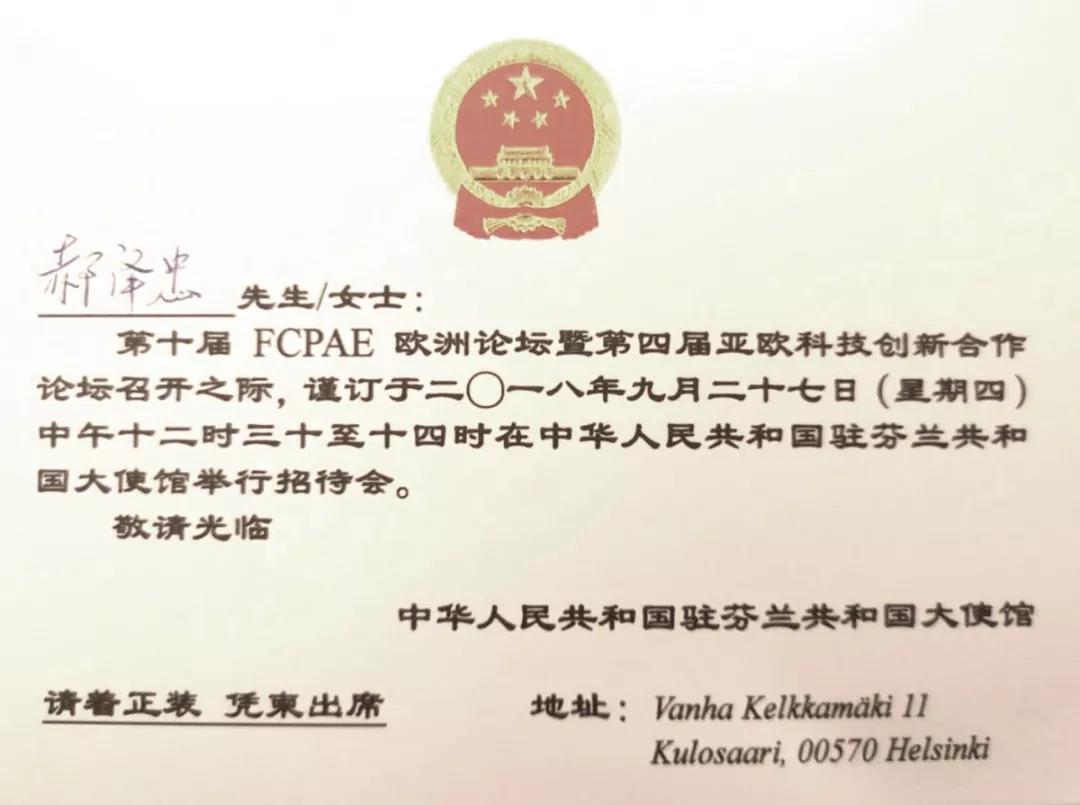 全球公益系列活動在芬蘭傳遞期間正值第十屆FCPAE歐洲論壇暨第四屆亞歐科技創(chuàng)新合作論壇在芬蘭赫爾辛基召開,倡導(dǎo)環(huán)保節(jié)能低碳的公益活動得到了論壇舉辦方以及中國駐芬蘭大使館的廣泛關(guān)注和大力支持,以中科宇杰董事長郝澤忠為代表的宣傳團(tuán)一行受邀出席中國駐芬蘭大使館招待會。